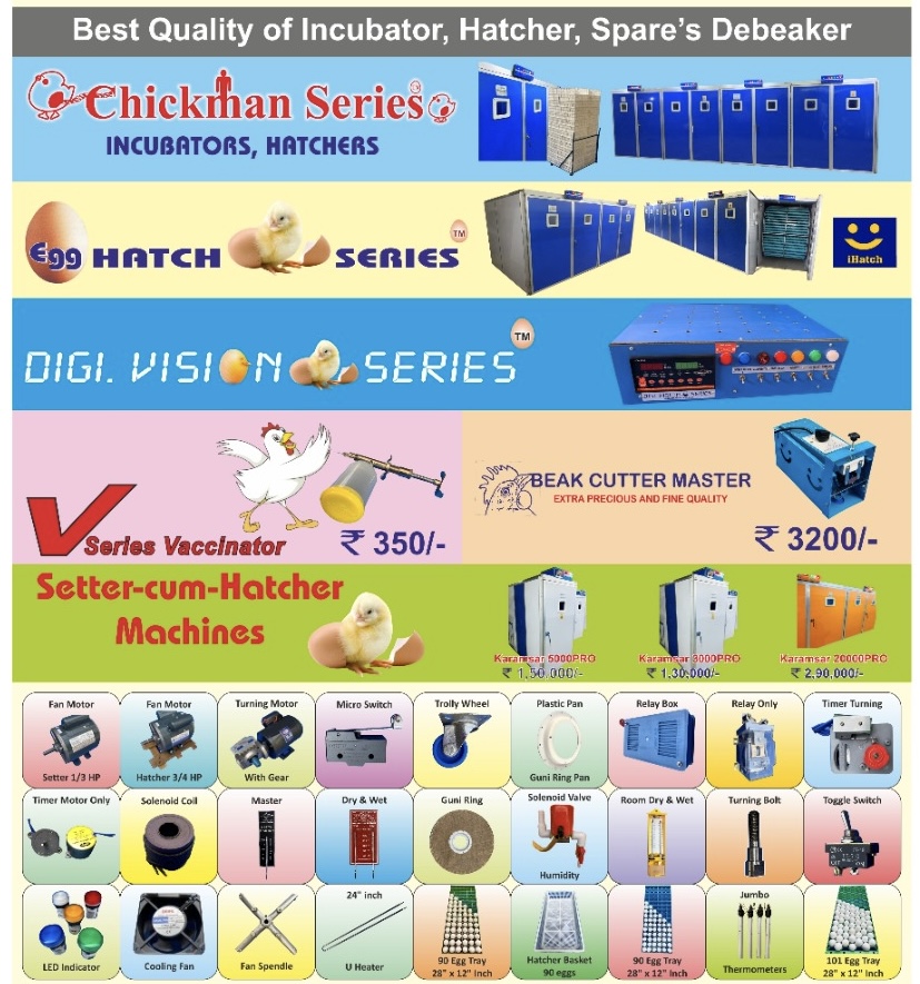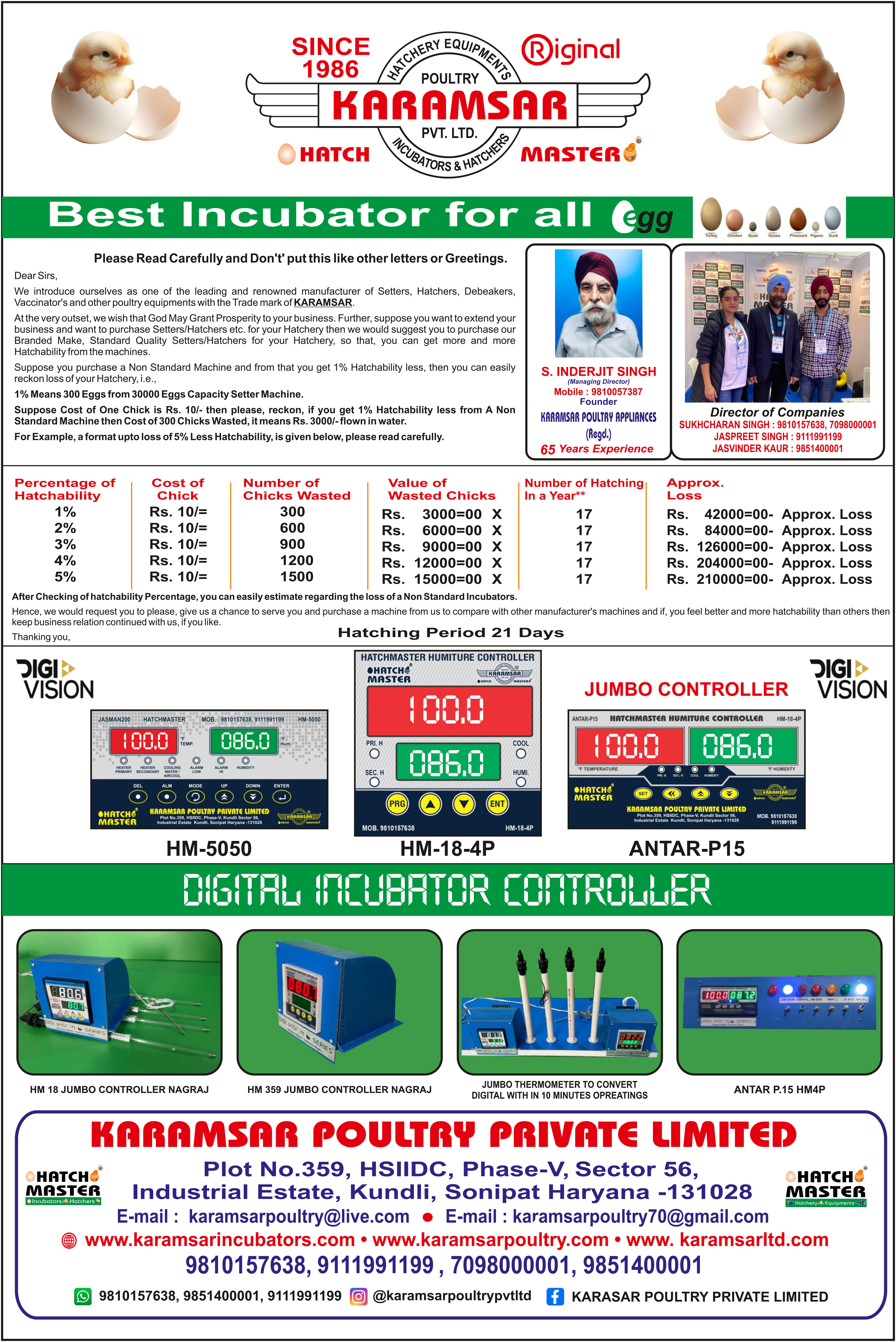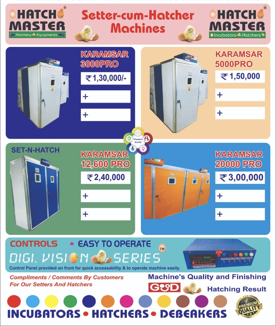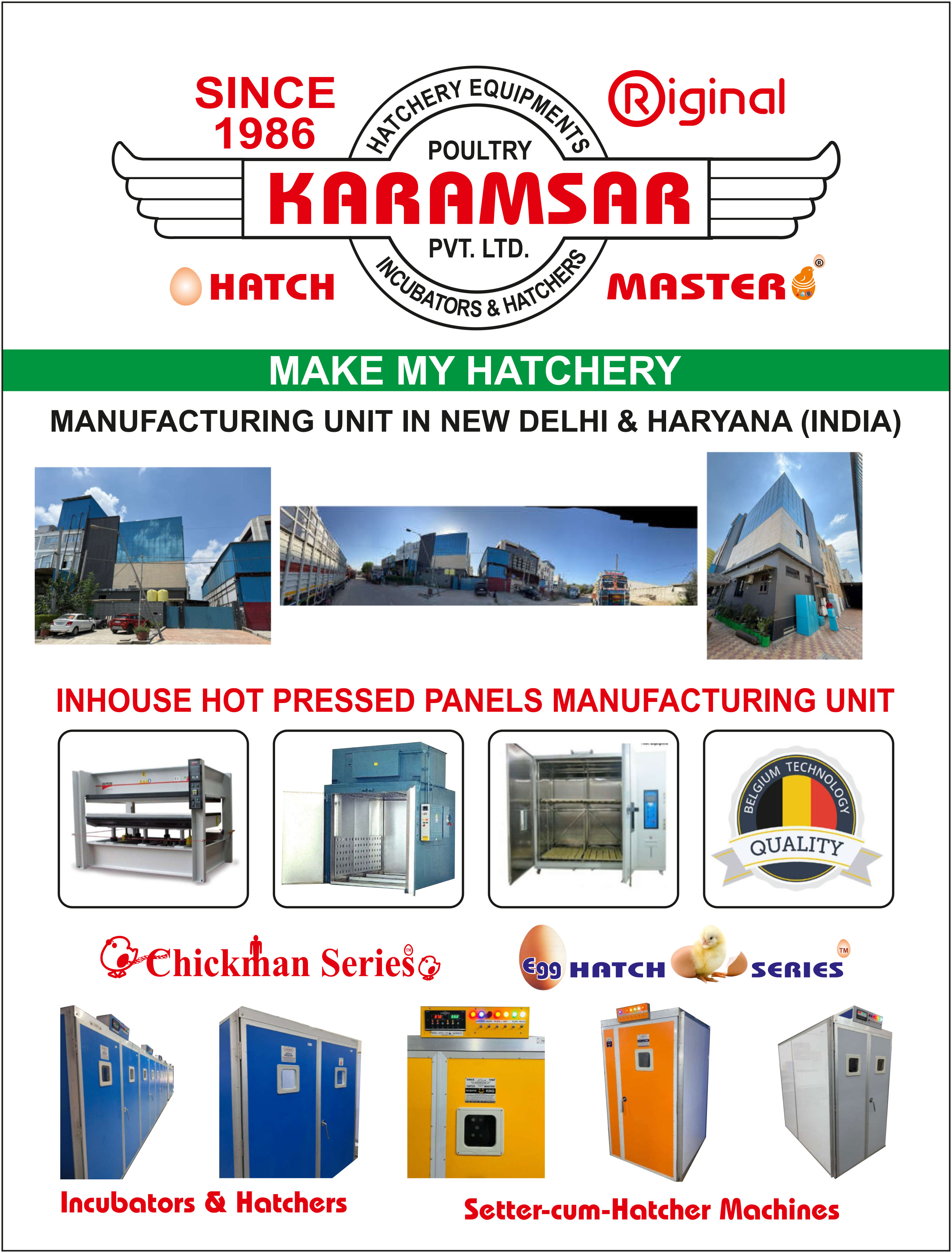 Since, insertion of the year 1986, the Company of Karamsar has pioneered in the art of Manufacturing Poultry Appliances in India. The Company is manufacturing Best Quality, Fully Automatic Incubators and supplying all over the India and exporting Nepal, Bangladesh, Oman, africa, Srilanka and U.A.E. Karamsar's Machines enjoys the most desireable status of providing best value for Money for all the equipments of Hatchery's Business.